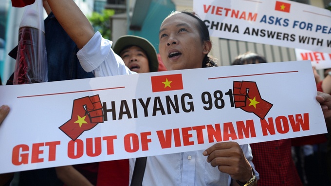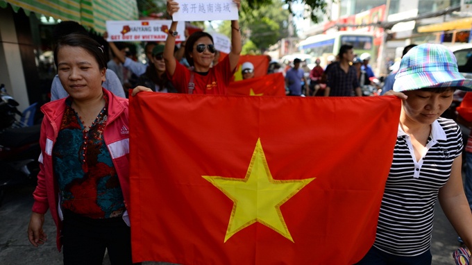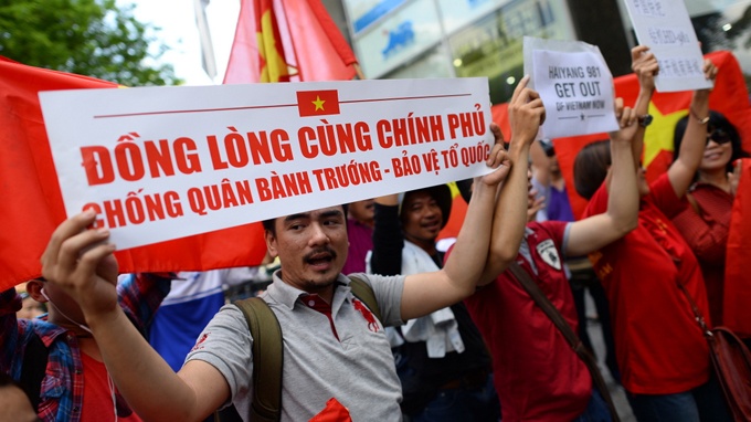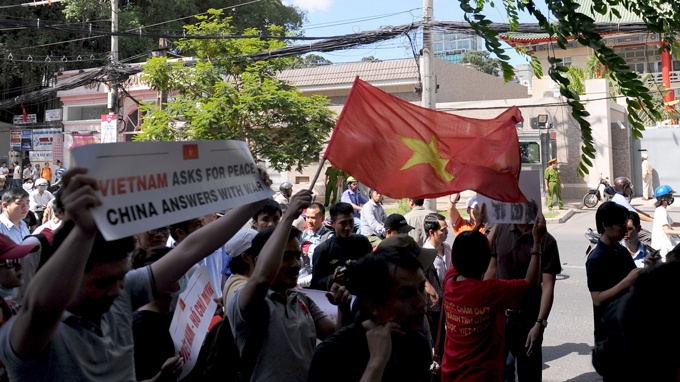 Những lá cờ đỏ sao vàng được phất lên, những biểu ngữ “Hoàng Sa - Trường Sa là của Việt Nam”, “Trung Quốc vi phạm luật pháp quốc tế”, “Yêu cầu rút giàn khoan HD981 khỏi biển Đông” bằng ngôn ngữ Việt - Trung - Anh được giương cao, những bài hát truyền thống, khẩu hiệu nối tiếp nhau vang suốt dọc đường. |