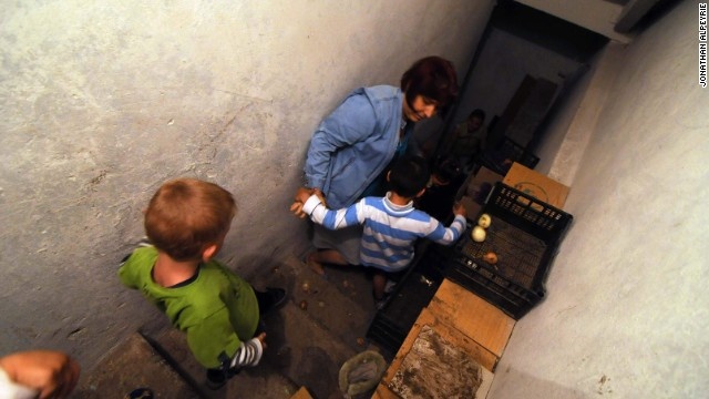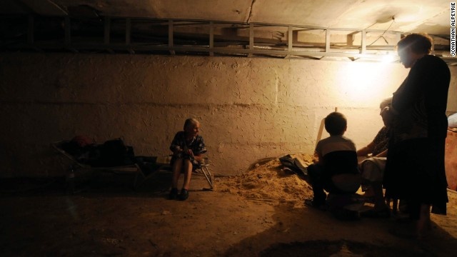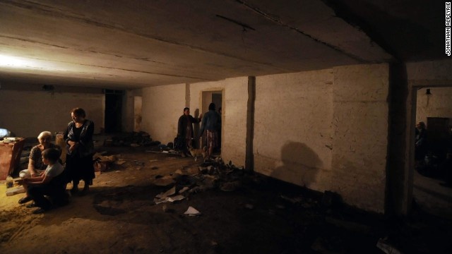 | Người dân địa phương trú ẩn dưới một căn hầm ở Donetsk. Những chiếc hầm này đều được xây dựng từ thời Xô Viết hoặc Thế chiến II. Những người vẫn kẹt lại vùng chiến sự hầu hết đều đã già, không có tiền và không đủ khả năng chạy trốn. |