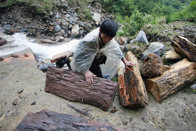 | Người dân cho biết, đây là gỗ quý (gỗ có ruột màu đỏ) có thể bán được hàng triệu đồng mỗi khúc. |