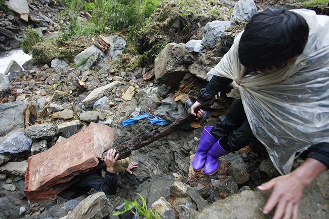 | Trưa 6/9 họ còn thuê cả mấy cẩu để vớt gỗ lên bờ với giá tiền 500.000 đồng. |