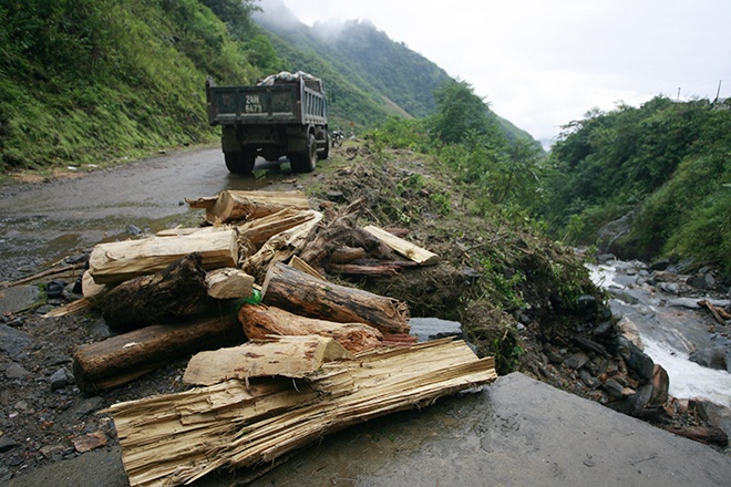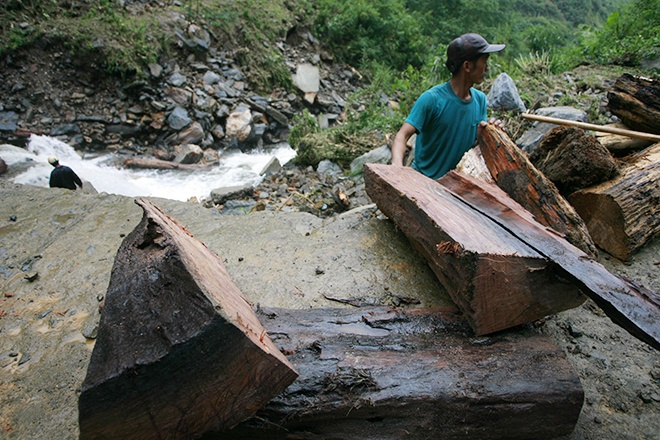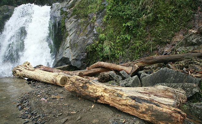 | Những khúc gỗ lớn chảy theo dòng nước, xuôi theo các con thác đổ xuống phía dưới. |
