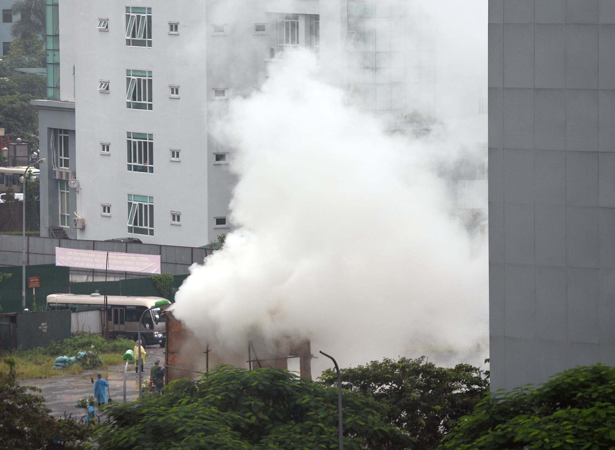 Theo ghi nhận, sau hai loạt tiếng nổ, khói trắng bốc cao tại khu vực phía sau Cung Trí Thức (đường Trần Thái Tông, Cầu Giấy).