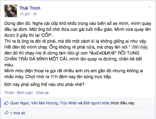Nữ ca sĩ bộc bạch: "Tôi dùng xe ở làn đường dành cho xe máy, không đứng bên hướng rẽ phải. Bên đó đang có rất nhiều xe máy khác. Khi đèn đỏ đếm lùi số, còn vài giây chuẩn bị sang đèn xanh (không phải từ vàng sang đỏ như độc giả hiểu lầm), một số người đã vượt đèn chạy trước. Tôi muốn tuân theo đúng luật nên vẫn chưa chạy thì người đàn ông này hai lần gõ vào biển số xe, hối thúc tôi chạy luôn. Sau đó, khi tôi bắt đầu chạy, người này không rẽ phải, mà đi thẳng rồi đạp tôi ngã lăn ra đường".