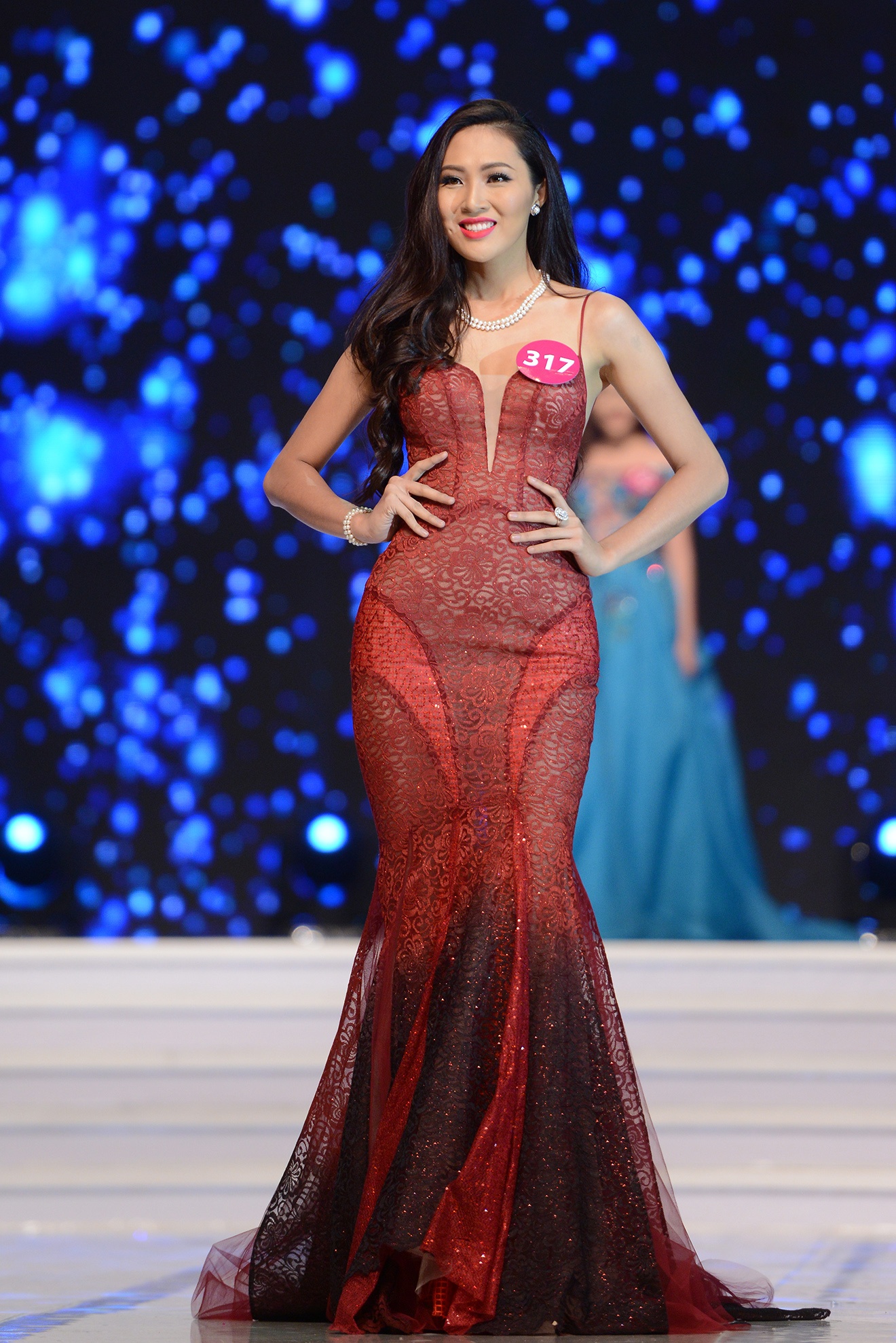 | Nguyễn Lê Sim, đến từ Kiên Giang, cũng là một trong những thí sinh nổi bật ở vòng bán kết. Trang phục dạ hội tông đỏ phối lụa mỏng bay bổng giúp người đẹp sải bước tự tin trên sàn diễn. |