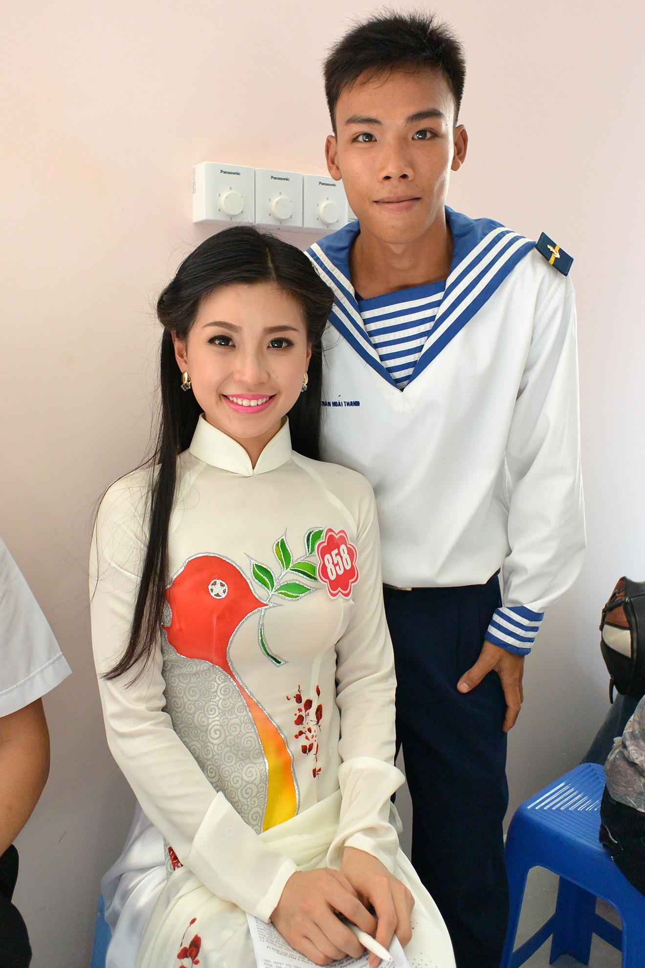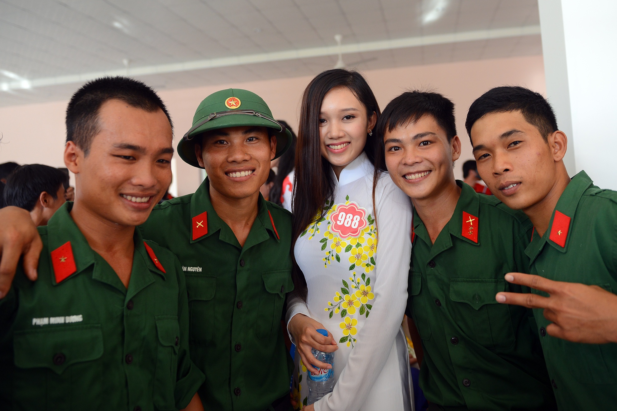 Các cô gái mặc áo dài khoe vẻ đẹp dịu dàng khi đứng cạnh các anh bộ đội chụp ảnh chung. Buổi giao lưu là một trong những hoạt động thuộc chương trình đồng hành cùng các thí sinh từ 23/11 tới đêm chung kết Hoa hậu Việt Nam vào ngày 6/12.