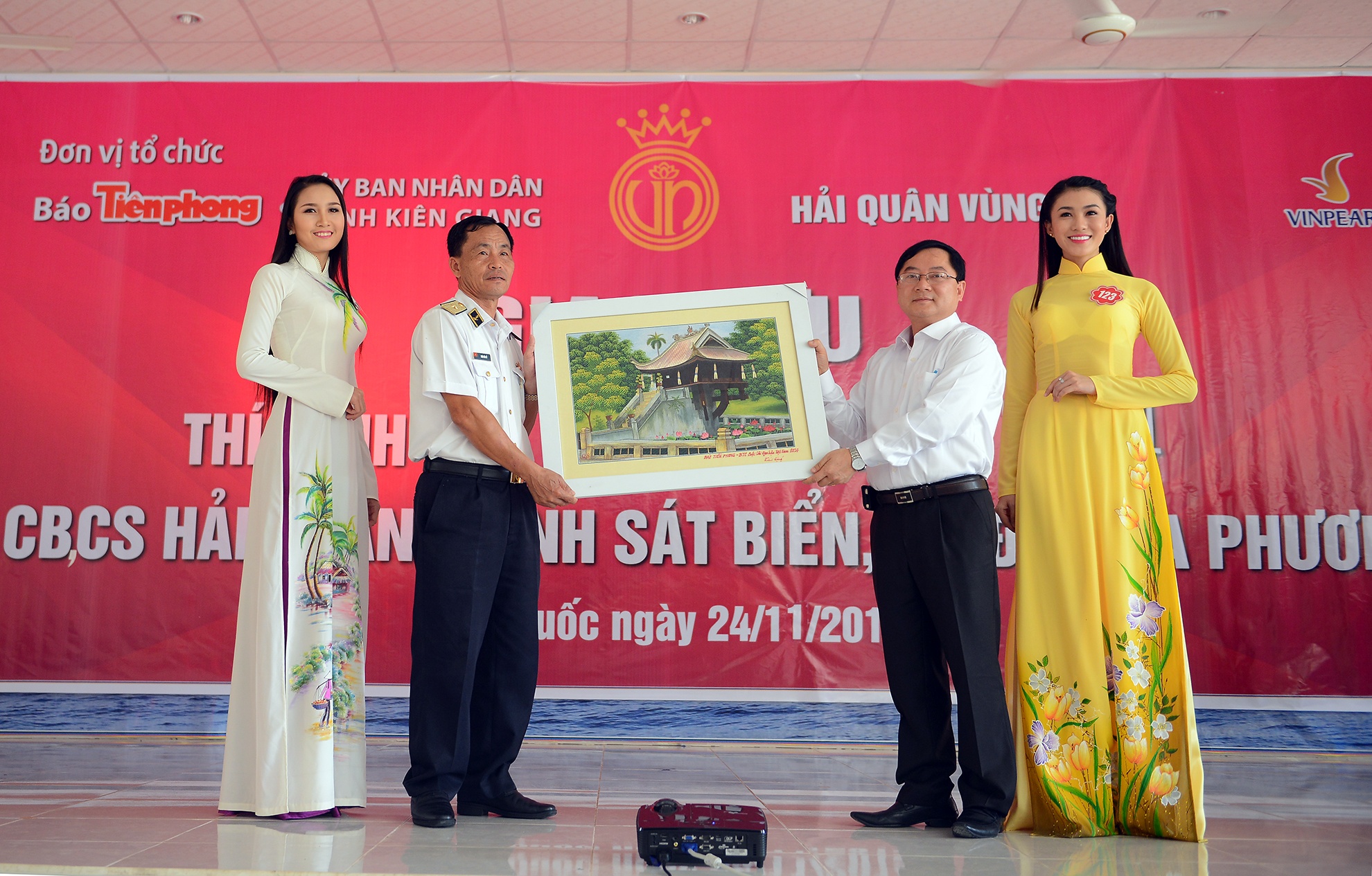 Nhân dịp này, ban tổ chức đã trao tặng một món quà ý nghĩa cho các chiến sĩ Hải quân, một bức tranh thêu Chùa Một Cột – biểu tượng của Hà Nội.