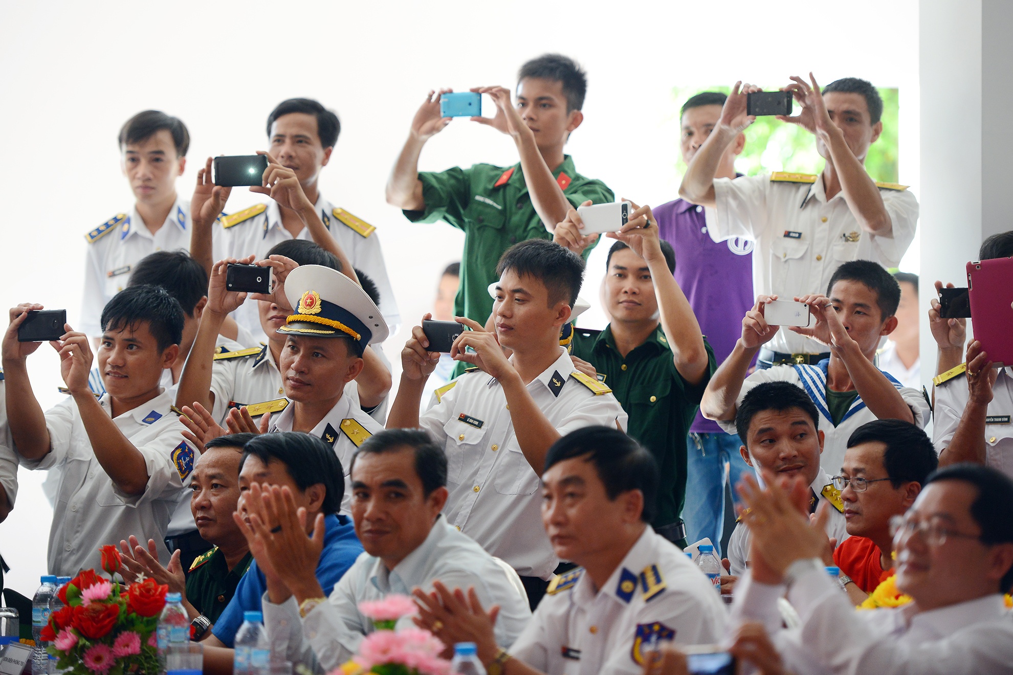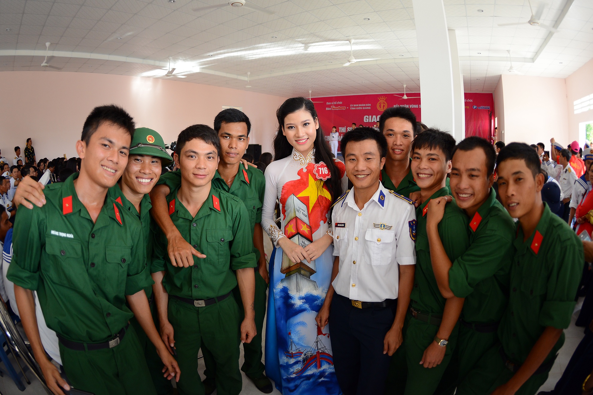 38 thí sinh Hoa hậu Việt Nam 2014 liên tục được những người lính Hải quân Vùng 5 quây quanh chụp ảnh chung nhân dịp các người đẹp cùng ban tổ chức tham dự buổi giao lưu.