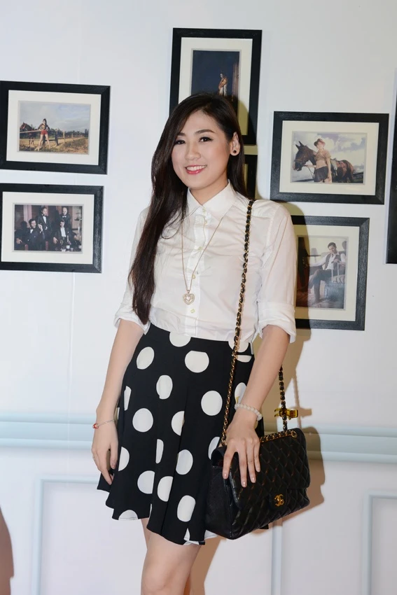 | Tới chúc mừng NTK Hoàng Ngân, Tú Anh chọn chiếc áo chemise trắng cùng váy chấm bi đơn giản nhưng phù hợp với tuổi và vóc dáng của mình. |