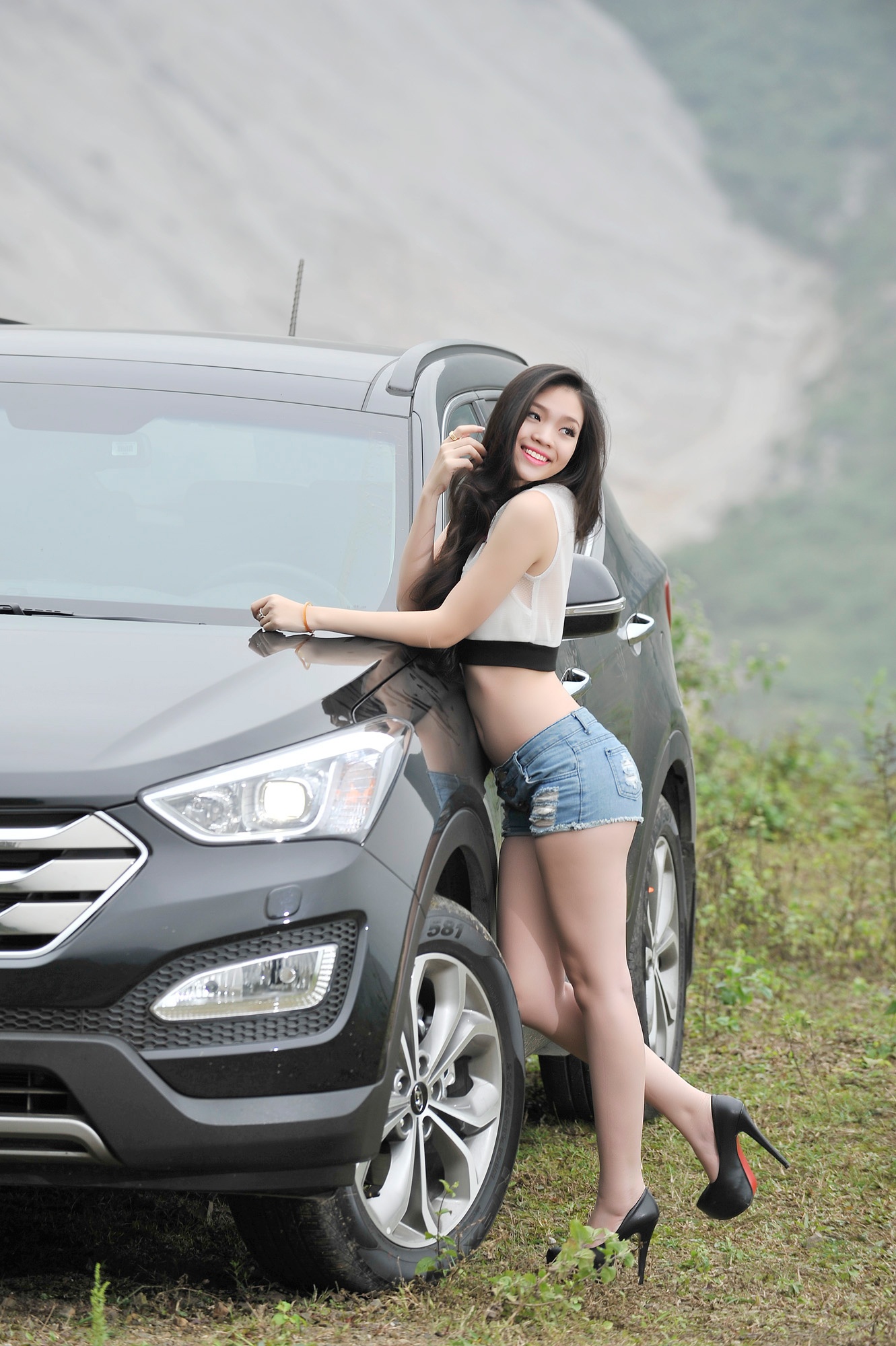 Thiếu nữ Việt khoe dáng với Hyundai Santa Fe 2015 trong bối cảnh miền đồi núi hùng vĩ cùng những cung đường quanh co vùng Tây Bắc.