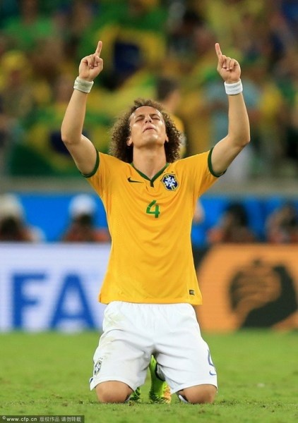 | David Luiz quỳ xuống sân cỏ ăn mừng chiến thắng. |