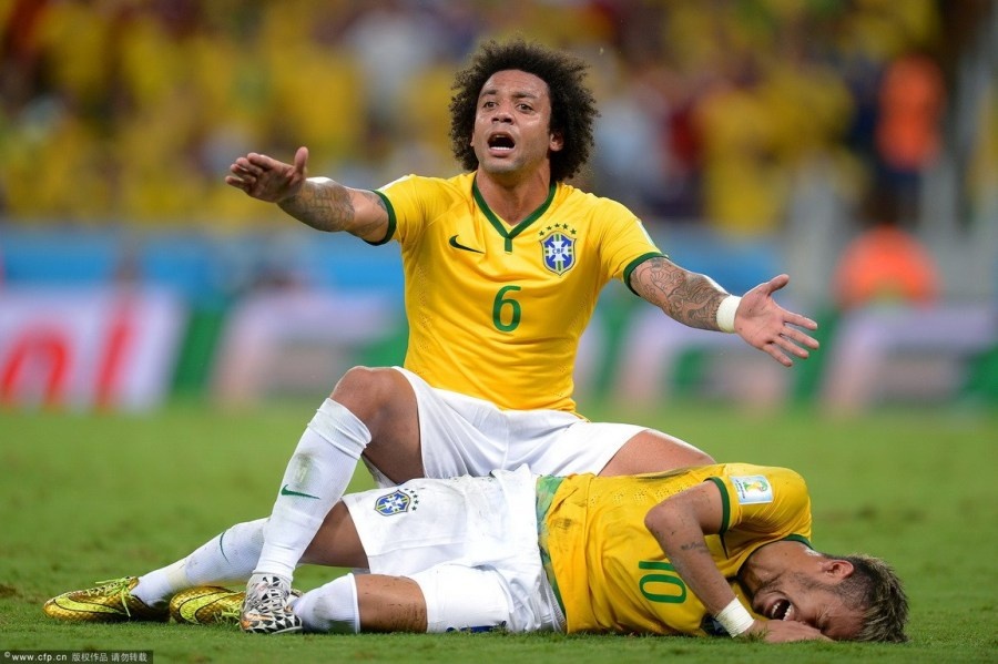 | Marcelo hoảng hốt gọi bác sĩ khi Neymar bị chấn thương. |