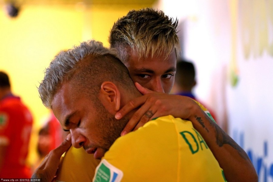 Neymar an ủi Alves sau trận thua thảm của Brazil.