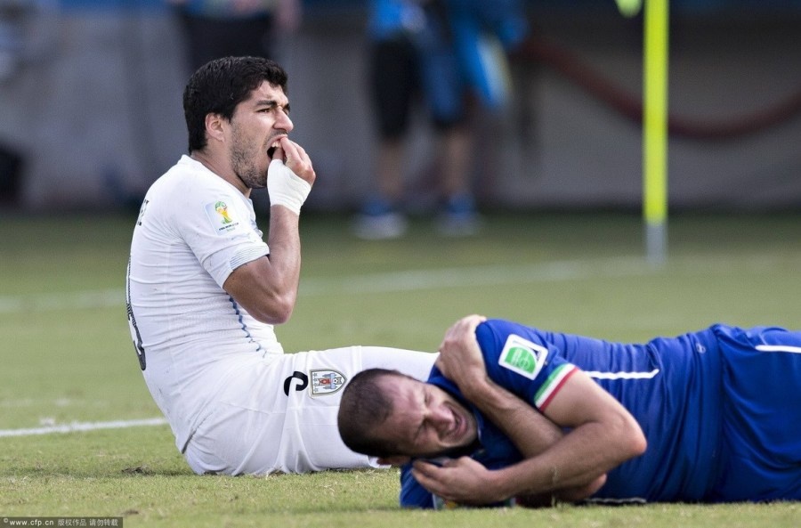Cầu thủ người Italy Chiellini vạch áo khoe vết cắn của Suarez.