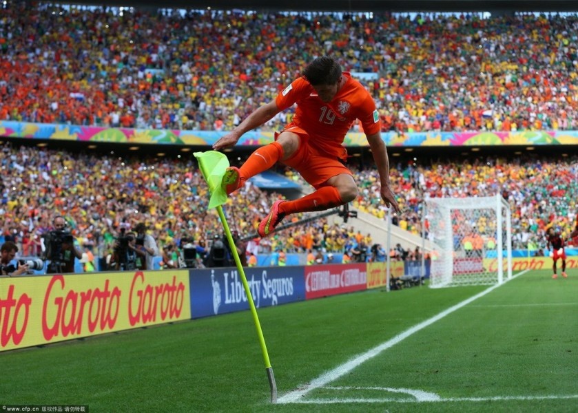 Huntelaar phấn khích bay người đạp vào cột cờ góc sân sau khi ghi bàn ấn định chiến thắng cho tuyển Hà Lan ở trận gặp Mexico.
