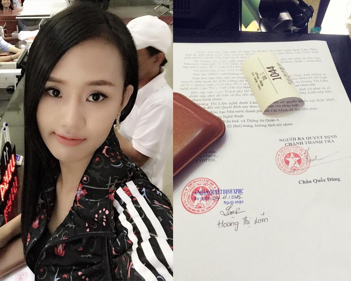 Sáng 4/11, Lâm Thùy Anh đã có mặt tại Sở VHTT&DL TP HCM để nộp số tiền phạt là 22,5 triệu đồng. Đây là mức phạt mà Sở đưa ra sau khi xem xét bản tường trình của Lâm Thùy Anh và có buổi làm việc với cô.