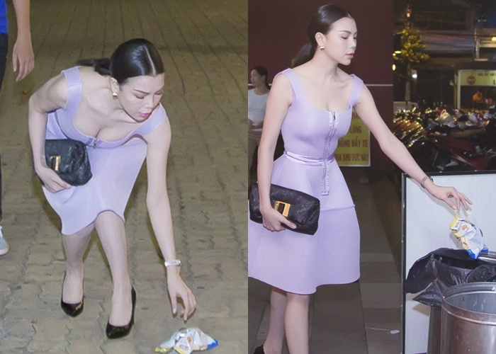 | Bắt chước hành động của Angela Phương Trinh, mới đây Trà Ngọc Hằng cũng trở thành tiêu điểm trên các trang mạng vì hành động nhặt rác trước đám đông. Theo đó, cô diện váy áo hàng hiệu trăm triệu, tới tham dự một show truyền hình thực tế, trước mặt các ống kính phóng viên, cô rất biết ghi điểm khi cúi người nhặt vỏ rác bừa bãi trên sàn. |