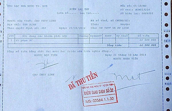 | Hóa đơn nộp phạt của Cao Thùy Linh. |