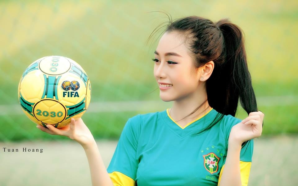 Chân dài 17 tuổi Hồng Hân khoe đường cong rực lửa trong màu áo đội tuyển Brazil. Bước chân vào làng mẫu Việt từ khá sớm, Hồng Hân từng giành giải Á quân cuộc thi Viet Fashion Icon 2014 và đang đầu quân cho một công ty người mẫu ở TP. HCM. Ảnh: Nam Dương. |