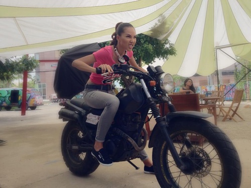 | Nữ diễn viên Hiền Mai càng thêm nhỏ bé khi cưỡi mô tô. |