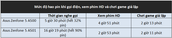 | Bảng so sánh về mức độ hao pin của 2 phiên bản Asus Zenfone về thời gian nghe gọi, xem phim và chơi game được đăng tải trên diễn đàn Vnreview. |