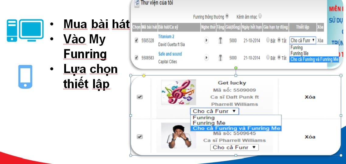 Ngoài ra thuê bao có thể mua thêm bài hát bằng cách soạn "Mua MãBH” gửi 9224, sau đó soạn "Cai MãBH" gửi 9224 để cài đặt cho tính năng Funring Me của mình.