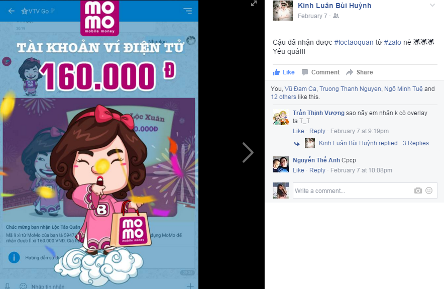 Ngay sau khi có lì xì theo phong cách trẻ trung, đậm tính công nghệ thú vị này, nhiều người dùng nhanh chóng khoe phần lộc xuân may mắn trên mạng xã hội. Bạn Thu Thủy (quận Bình Thân, TP HCM) bình luận trên Zalo "Lộc Táo quân": “Tôi nhận được lì xì trong lúc xem tivi chờ giao thừa, vừa ngạc nhiên vừa vui. Ngay mùng 2, tôi mở ví điện tử và dùng mã số ưu đãi mua vé xem phim. Quà giá trị không lớn nhưng cảm thấy vui và may mắn lắm”.