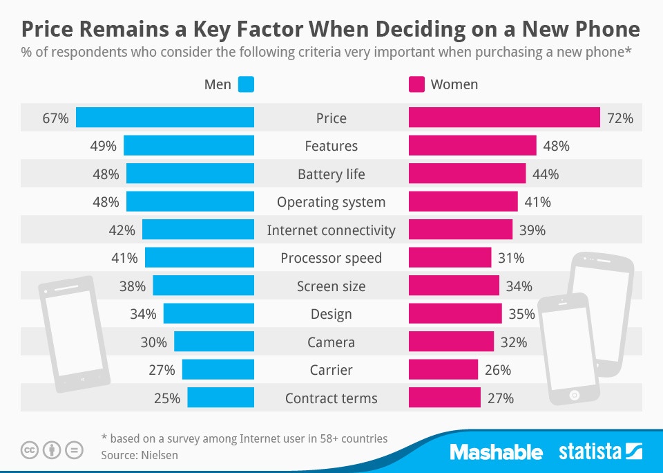 Khảo sát được thực hiện tại 58 quốc gia đã chỉ ra, nữ giới đặc biệt quan tâm đến giá bán, camera của smartphone, trong khi nam giới chú trọng đến hệ điều hành, kích thước màn hình và tốc độ xử lý của sản phẩm nhiều hơn nữ.