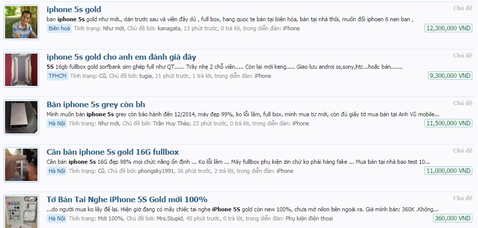 Dạo quanh các diễn đàn rao vặt và thương mại điện tử hiện nay, lượng rao bán iPhone 5S trong những ngày qua của những người dùng cá nhân tăng mạnh. Phần lớn những chiếc iPhone 5S được rao mức 10-11 triệu đồng với tình trạng mới khoảng 80%. Với những máy gần như mới (trên 95%), giá có thể lên đến 12 triệu đồng.