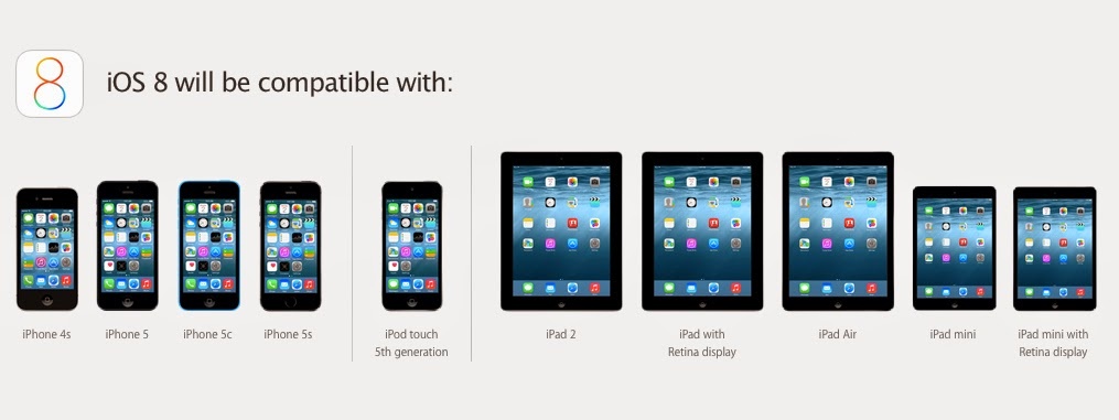 | Theo Apple, những thiết bị có thể nâng cấp lên iOS 8 bao gồm: iPhone 4S/5/5S/5C, iPad 2/3/4/Air/Mini/ Mini Retina và iPod Touch 5G. |