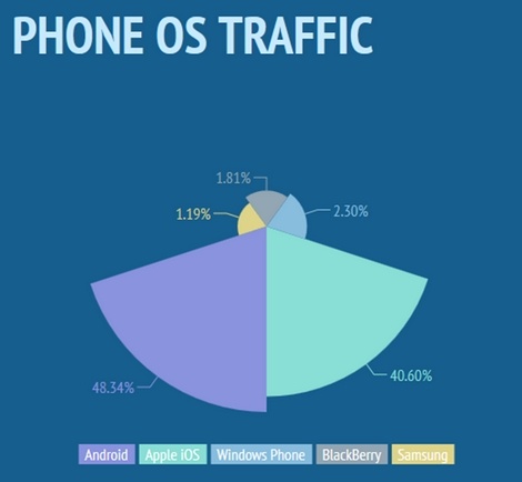 Theo thống kê này, lượng người dùng truy cập nhiều nhất đến từ hai nền tảng iOS (40,6%) và Android (48,34%). Windows Phone xếp ở vị trí thứ ba với lượng truy cập chiếm 2,3%.