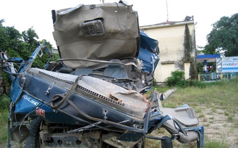 | Chiếc xe tải chở xi măng nát bét sau khi bị mái cổng trường rơi xuống. |