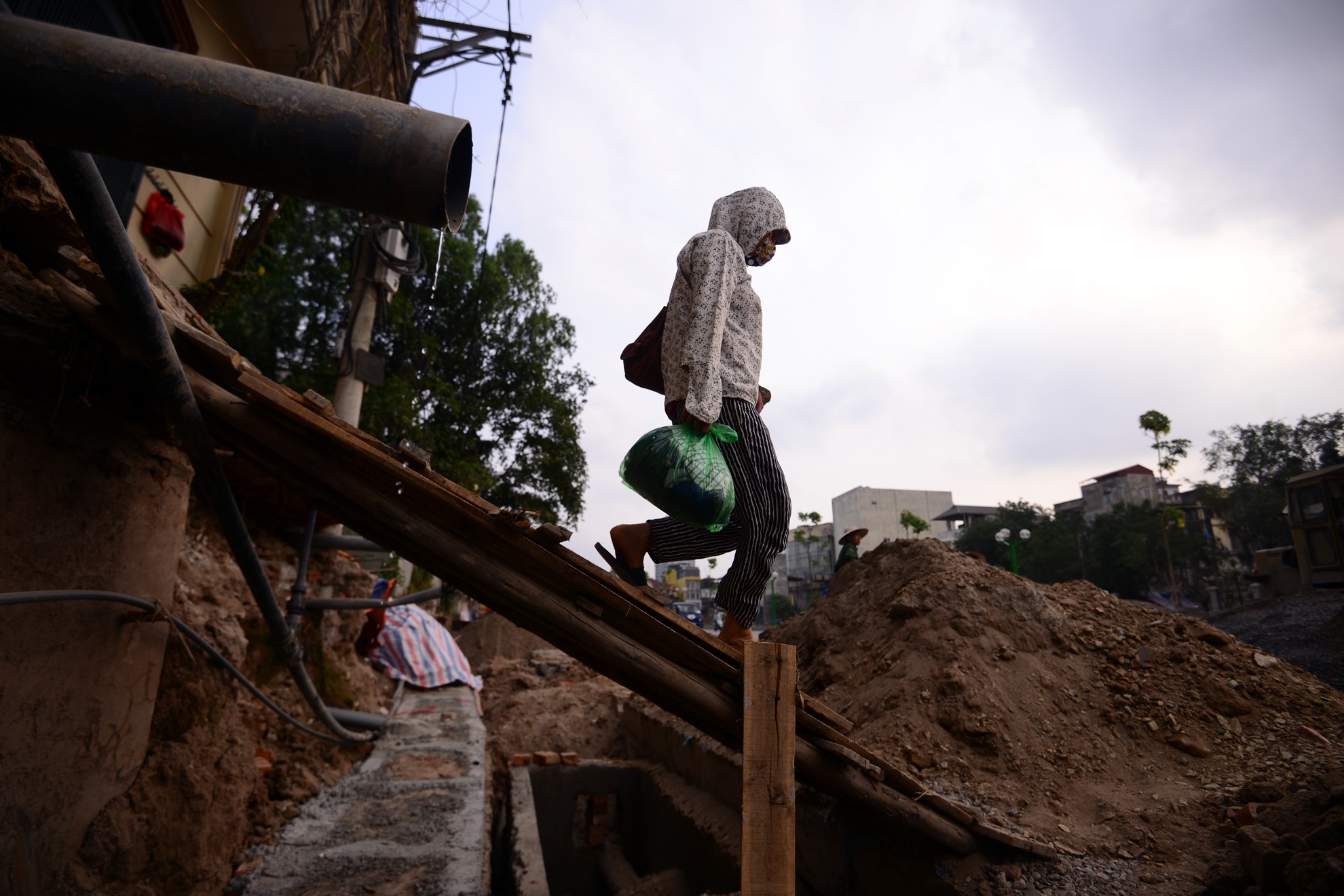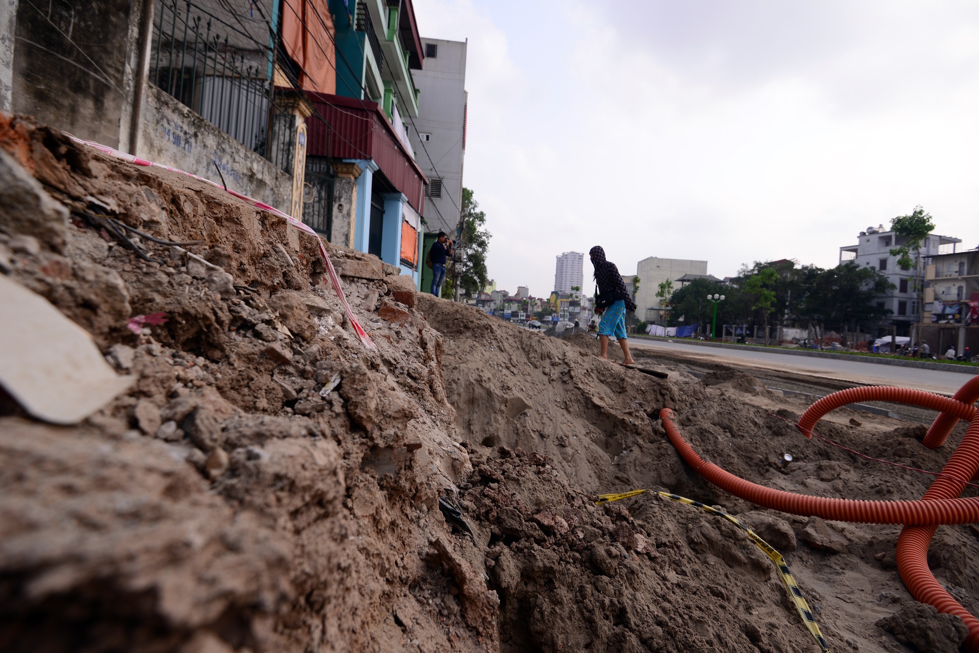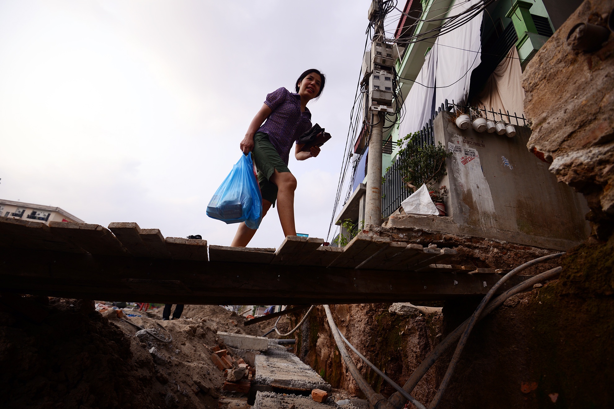 "Công trường ngổn ngang khiến việc đi lại khó khăn. Gia đình tôi lúc nào cũng phải cắt cử người trông trẻ con vì sợ chúng ngã xuống đường", người phụ nữ áo hồng than thở.