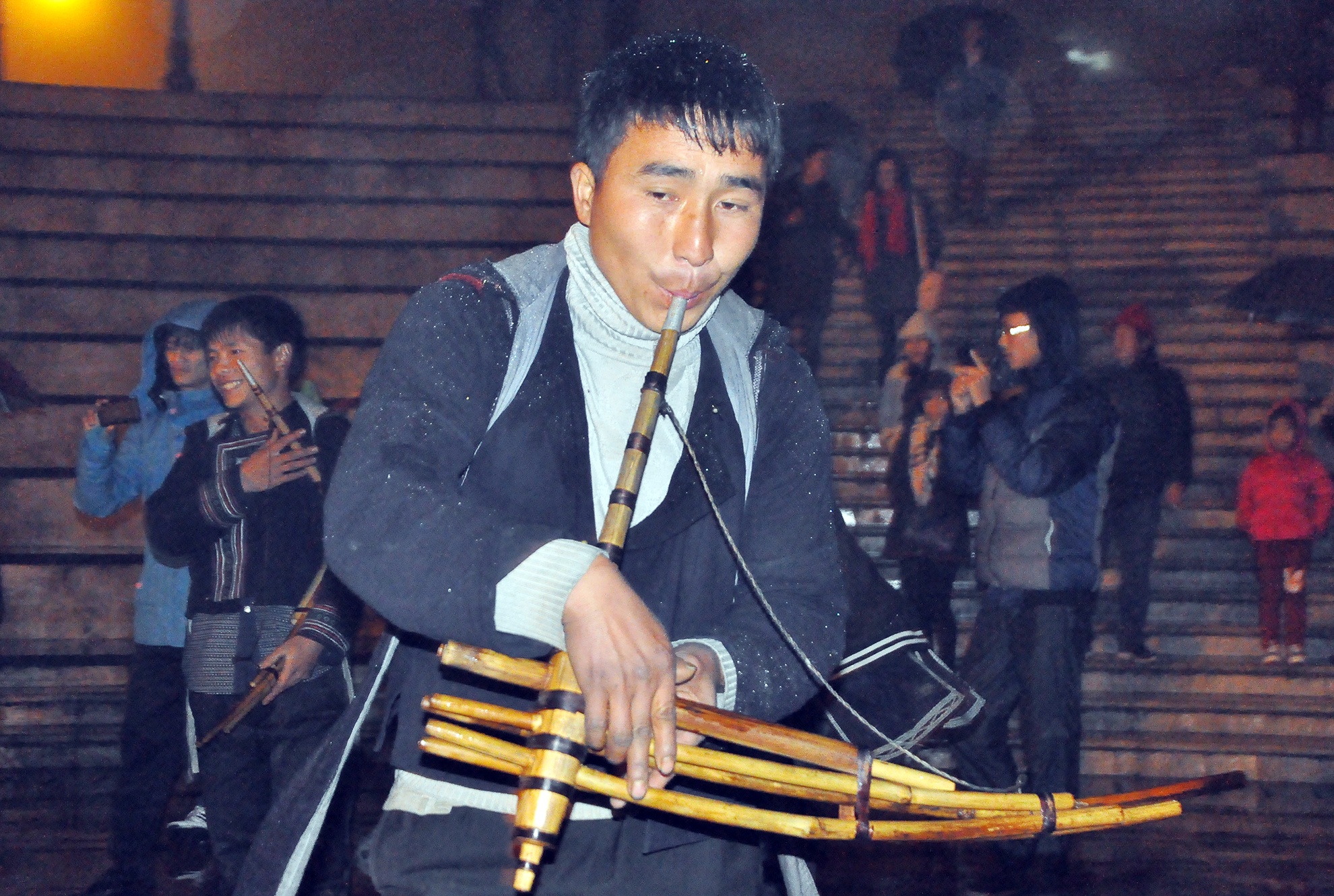 | Đêm chợ tình ngày cuối tuần ở thị trấn Sa Pa, các chàng trai mang khèn ra thổi để tìm bạn gái. Ảnh: Hoàn Nguyễn. |