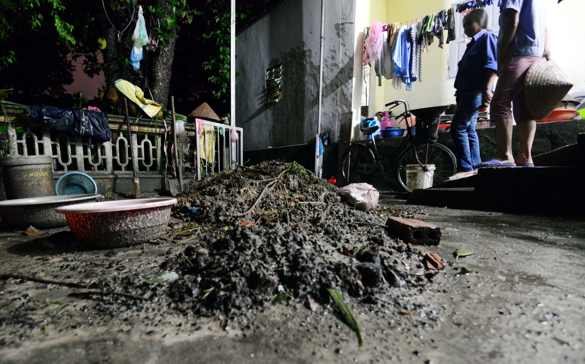 Sau trận mưa gây sạt lở ngày sáng 27/7, toàn bộ khu nhà chị Lan bị ngập sâu hơn 1 m. Tủ lạnh, tivi vẫn còn nhưng đều bị hư hỏng "Tối đến tôi phải ngủ nhờ nhà họ hàng", chị nói.