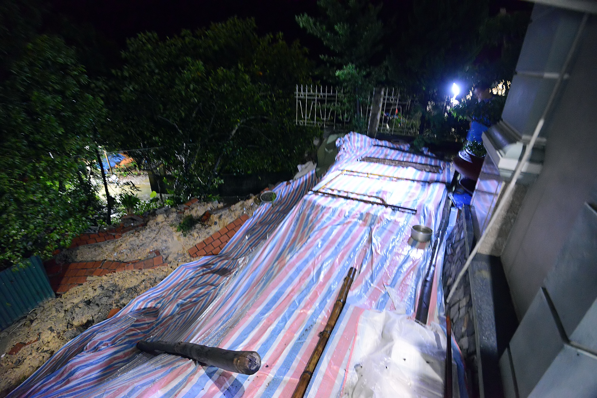 Trong khi đó, nhà anh Trần Văn Hòa lại bị sạt nửa nhà và phải đưa cả gia đình sang nhà cháu ngủ nhờ. Anh cố gắng khắc phục bằng cách che bạt cho khu đất còn lại để tránh mưa ẩm phòng sạt lở.