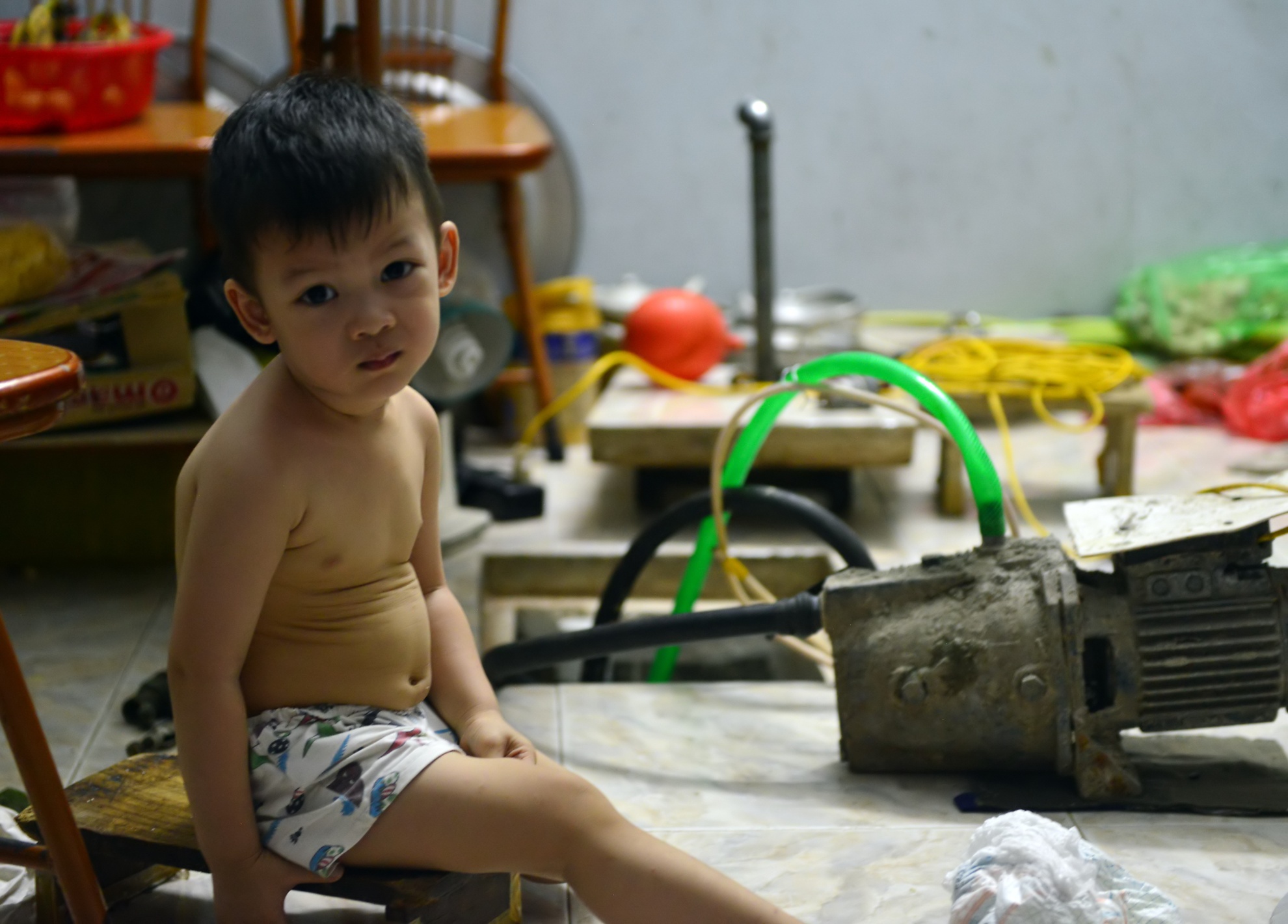 Bé Ken bên bể nước khô cạn của gia đình. Sáng 18/8, bố em mới quyết định lắp máy bơm để lấy nước hàng xóm về sử dụng.
