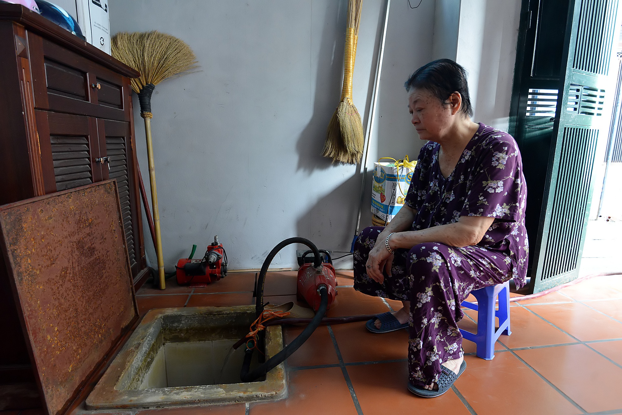 "Nhà tôi phải dùng bơm, nối ống sang nhà hàng xóm có giếng khoan để xin nước. 3 ngày xin một lần cũng đủ dùng đánh răng rửa mặt. Còn tắm rửa, vệ sinh cá nhân phải sang nhà người thân ở nơi khác", bà Nguyễn Thị Cúc nói.
