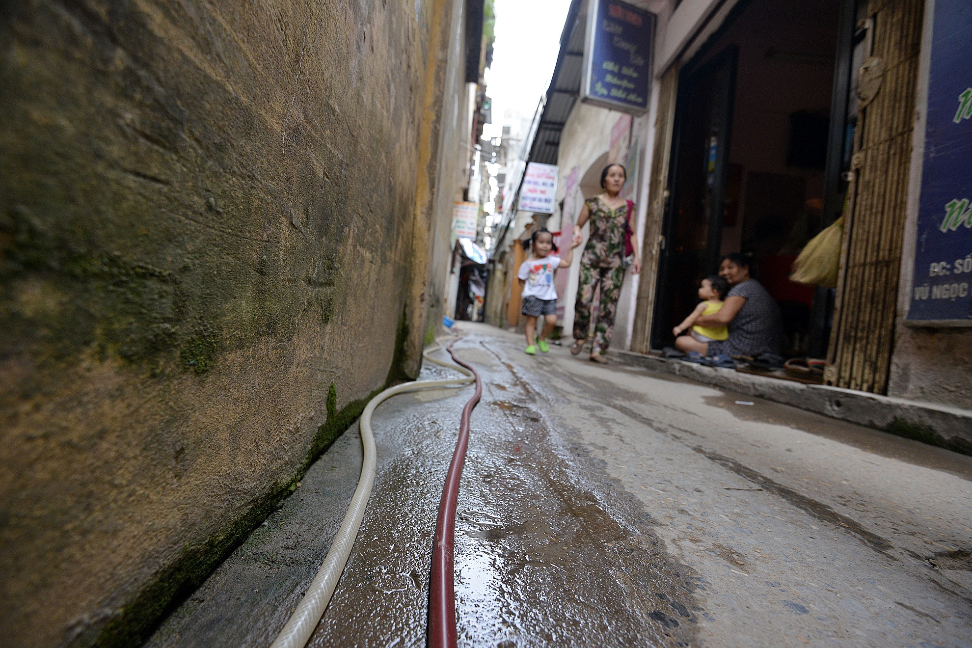 Đường ống nước nối chạy khắp con ngõ tổ 1, tổ 4. "Cảnh tượng thật khó chấp nhận ở trung tâm thủ đô", một người dân bức xúc.