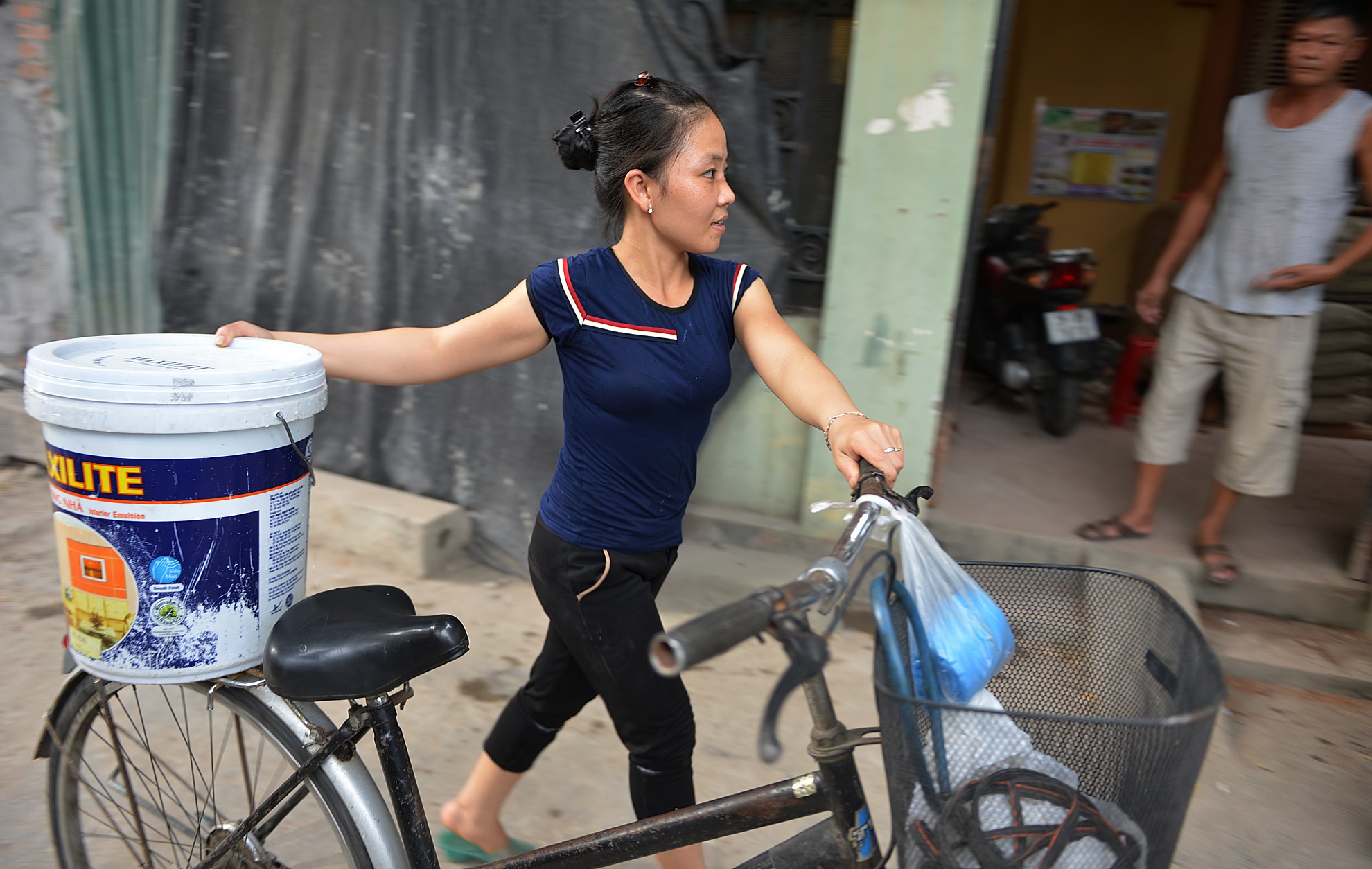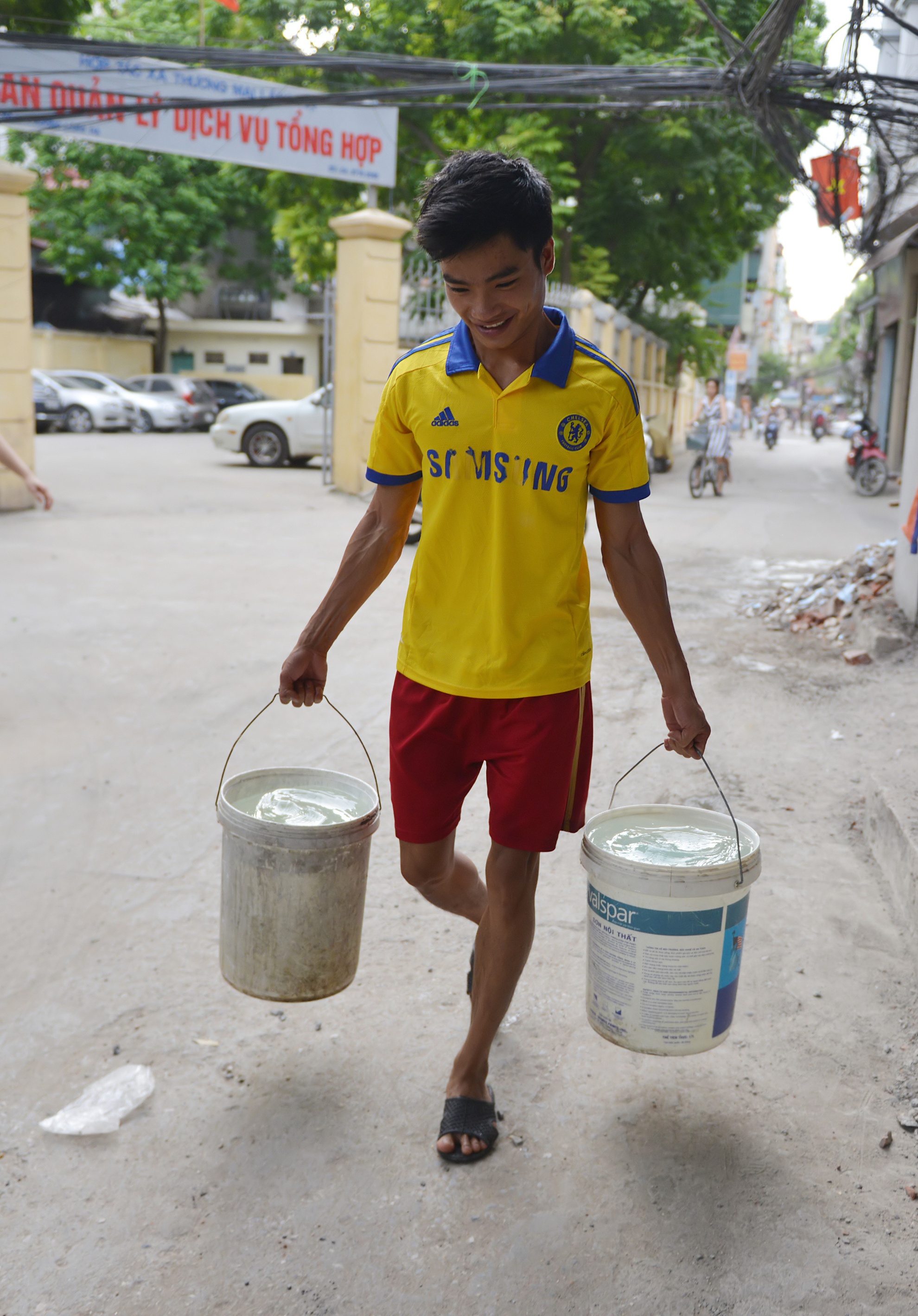 Vào buổi chiều, nhiều người dân dùng xô đi xin nước hoặc mua ở những trung tâm công cộng gần nhà với giá 3.000 - 5.000 đồng/xô. |