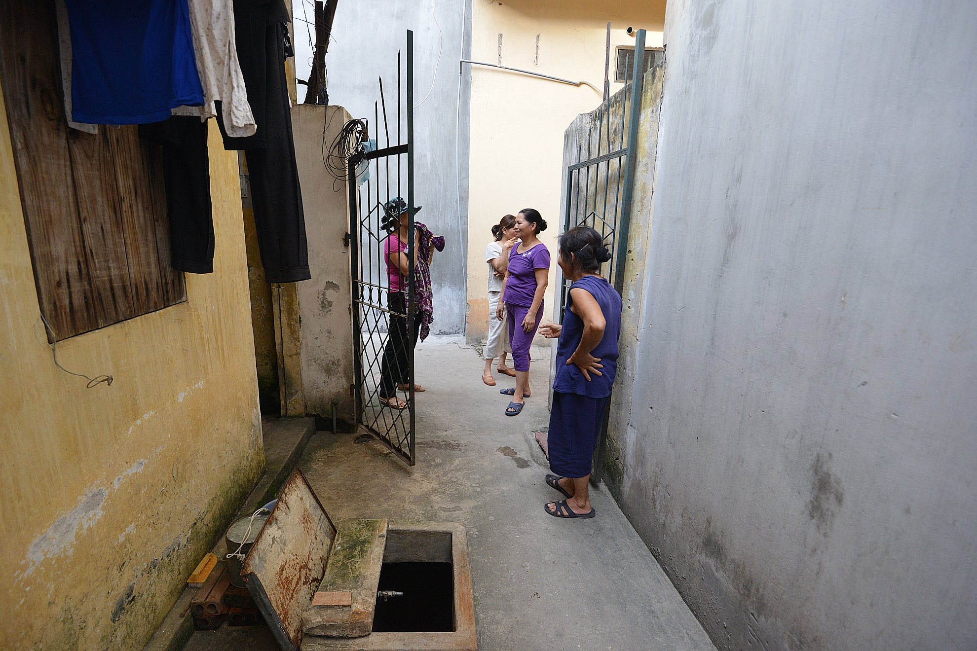 Người dân đứng khắp các con ngõ của phường Láng Hạ hỏi thăm, bàn tán chuyện về nước. Một số gia đình có lượng tích trữ gần 5 khối nước máy nhưng cũng chỉ đủ dùng trong hai ngày do quá đông người sử dụng.