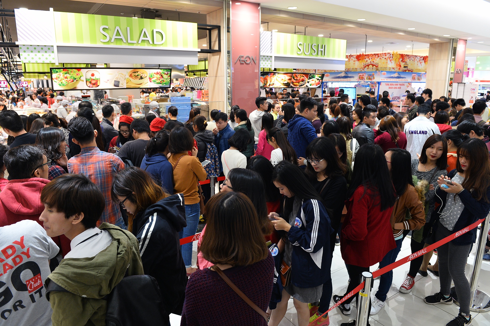 | Giới trẻ xếp hàng dài vào mua và thưởng thức salad, sushi Nhật. |