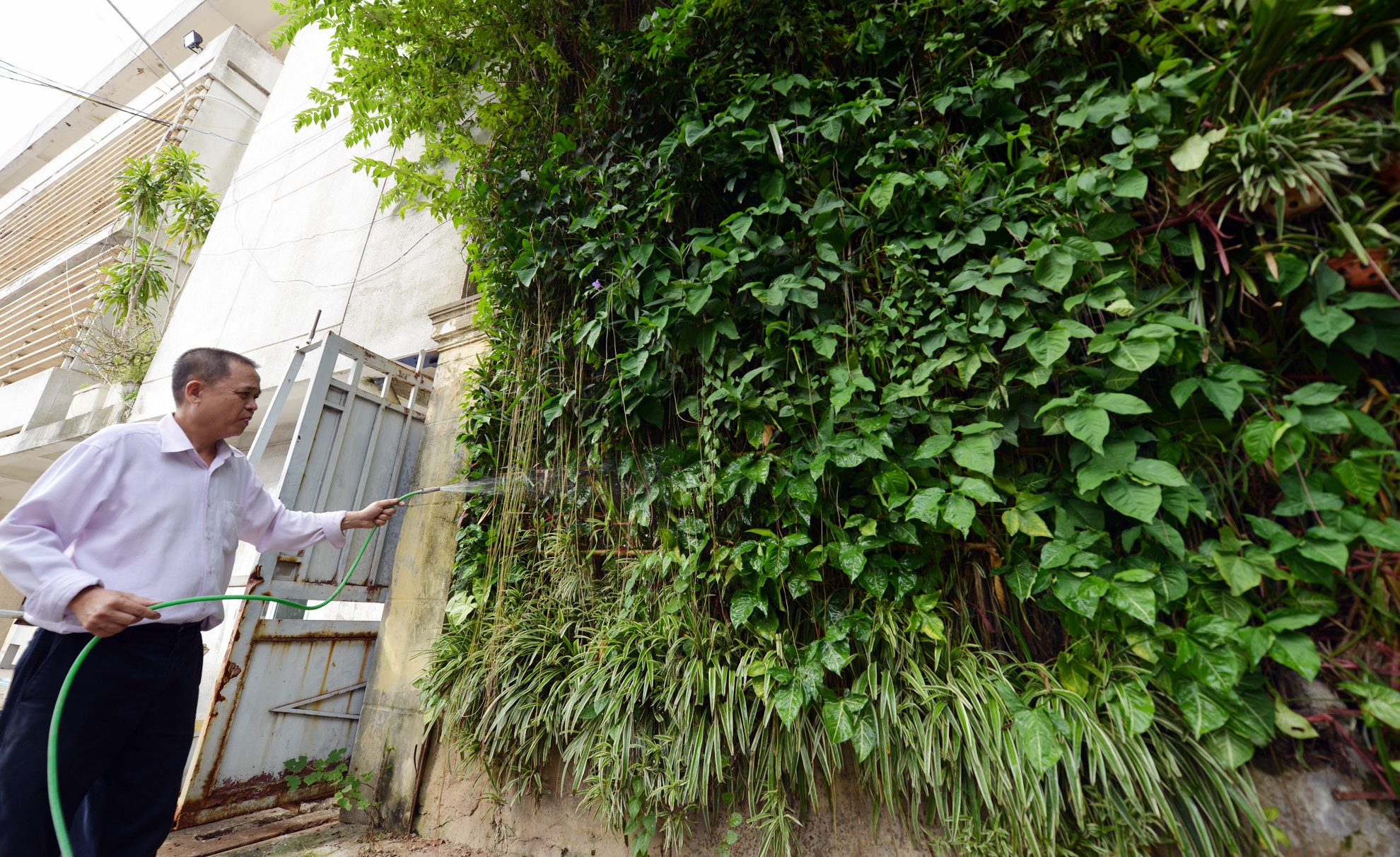 Trồng cây quanh nhà thường có độ thẩm thấu cao nên chủ nhà ngăn cách bằng các bức tường sơn vôi chống thấm và hàng rào sắt. Theo anh, ngôi nhà cây này, chi phí ban đầu để chống thấm và giữ vườn phủ kín khá tốn kém.