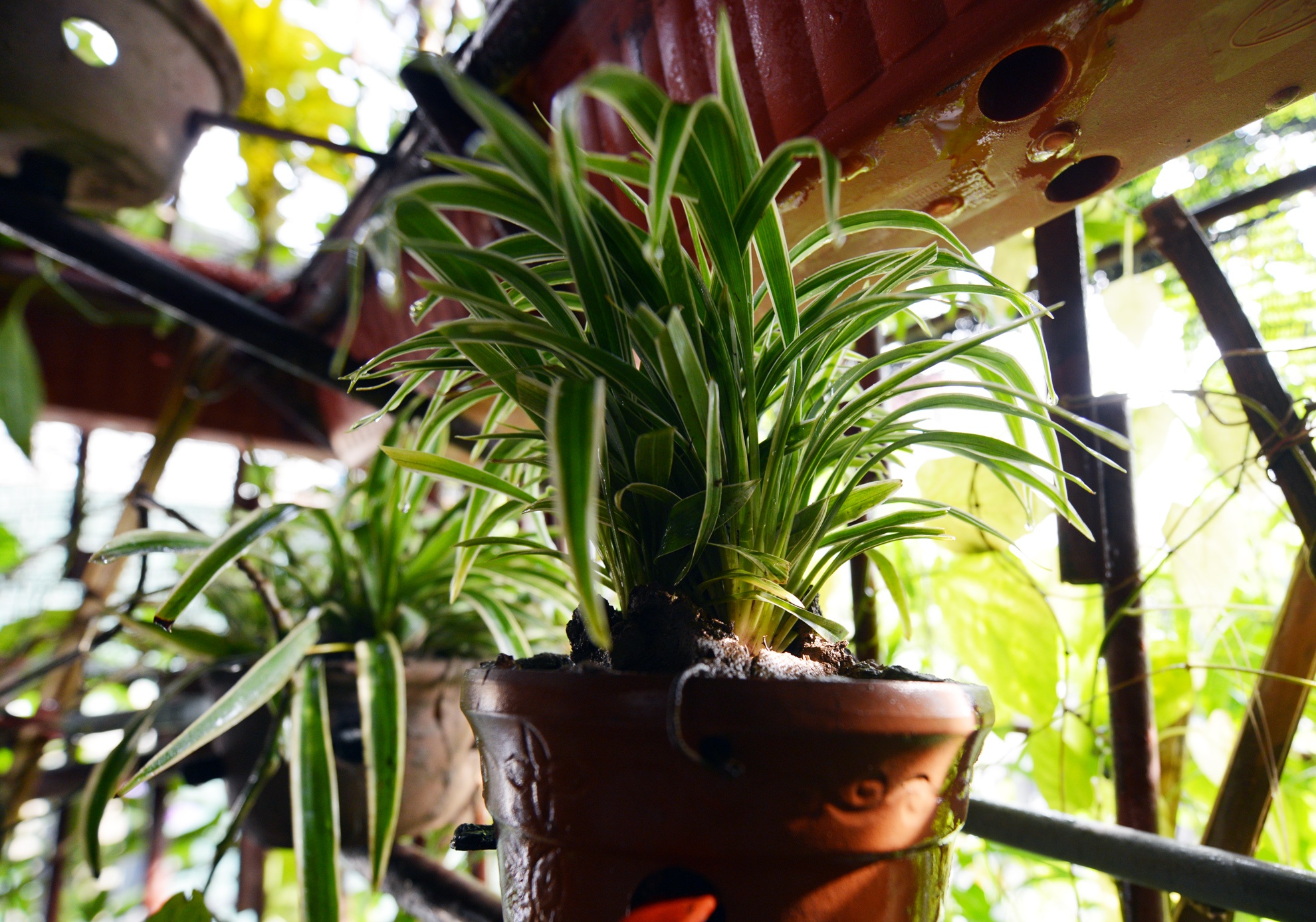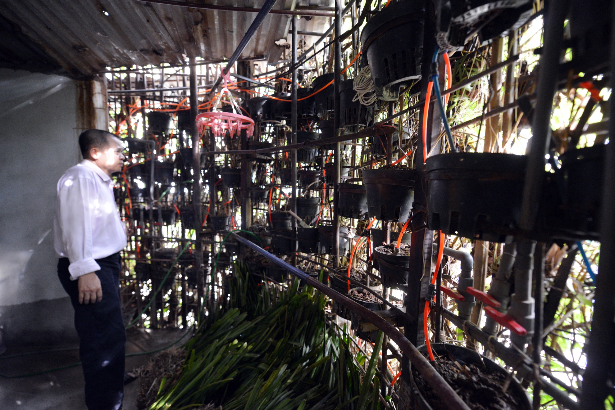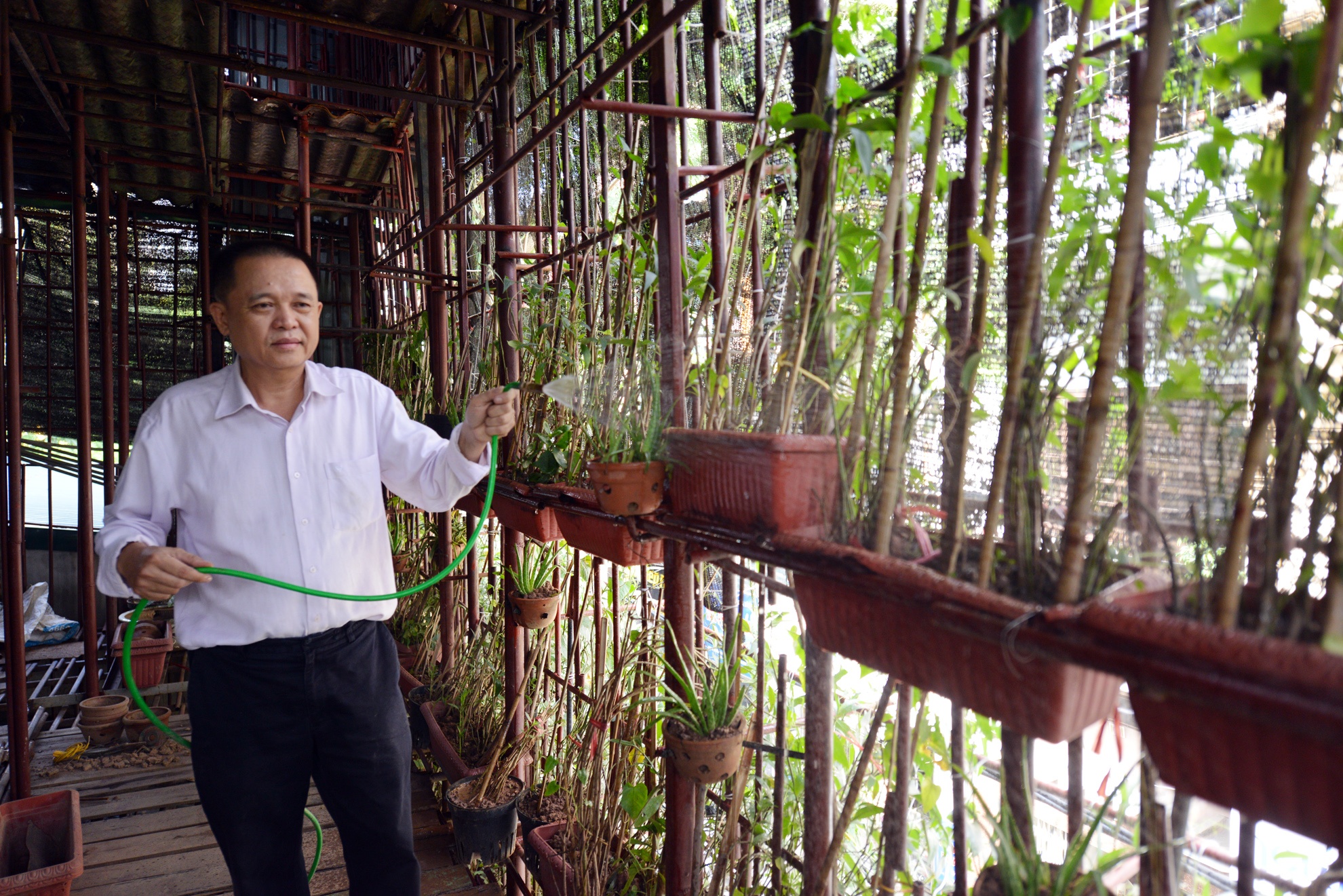 Tầng 2 được bao bọc hoàn toàn bằng sắt và cây xanh phủ bên ngoài. Đặc biệt, các loại lan rừng như bạch diệp, tai trâu, lan hồ điệp,... và cây nha đam được anh trồng nhiều. Anh cho biết, chi phí mua giống cây tốn kém ngang ngửa với tiền thuê thợ, mua đất, thiết bị. Tính đến nay, tổng chi phí mua giống cây, thuê thợ, thiết bị đã lên tới hơn 500 triệu đồng.