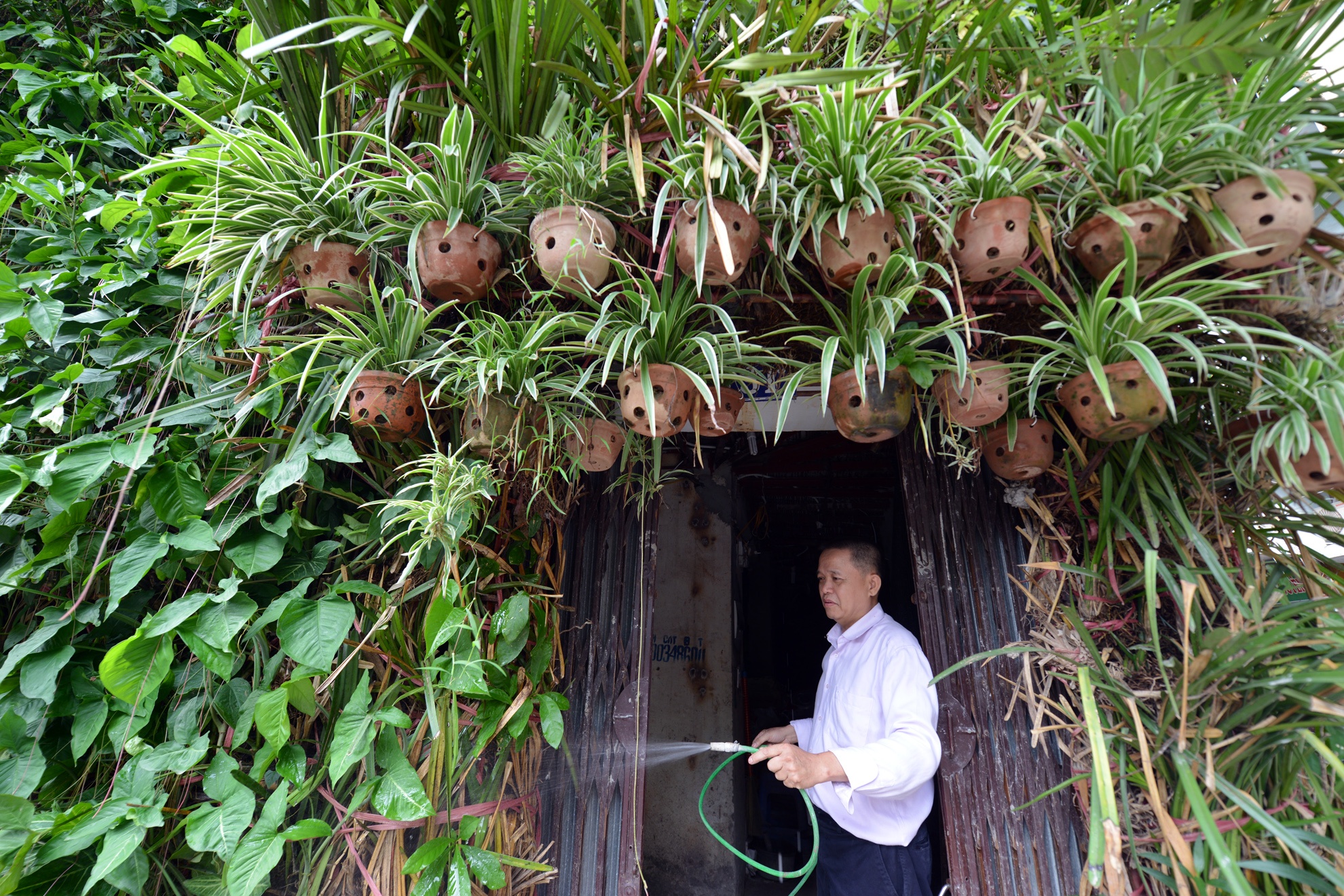 | Từng có kinh nghiệm lâu năm về cơ khí nên hệ thống vườn cây cho ngôi nhà do chính anh tự thiết kế. Hiện tại, ngôi nhà được phủ bởi hơn 30 giống cây khác nhau trồng trong 500 chiếc giỏ nhựa. Anh Minh chọn những loại cây chịu hạn tốt, giống khỏe như lan rừng, dâu hoàng đế, nha đam, dạ yến thảo... để trồng. Ngoài ra, các loại cây như trứng cá cũng được trồng trên tầng 2. |