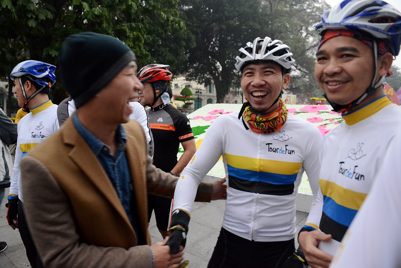 | Anh Phú ( Ngõ Huyện, Hàng Trống, Hà Nội) bắt tay chúc mừng năm mới với các anh em trong câu lạc bộ xe đạp của mình. |