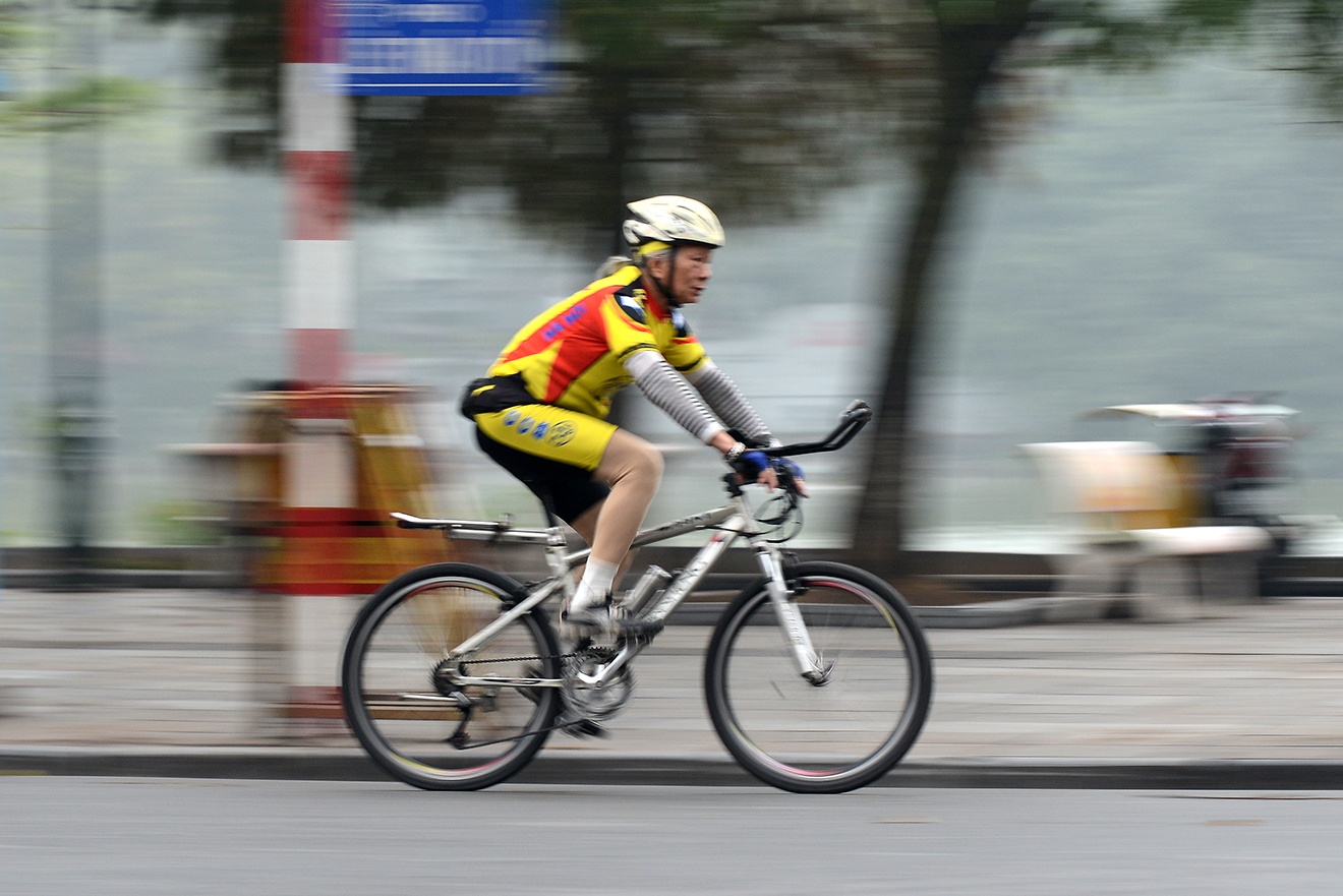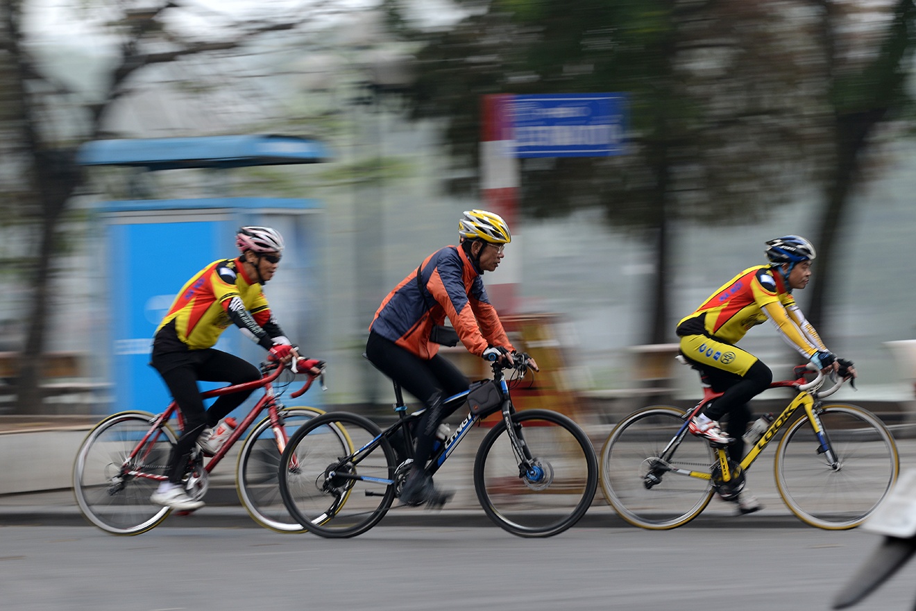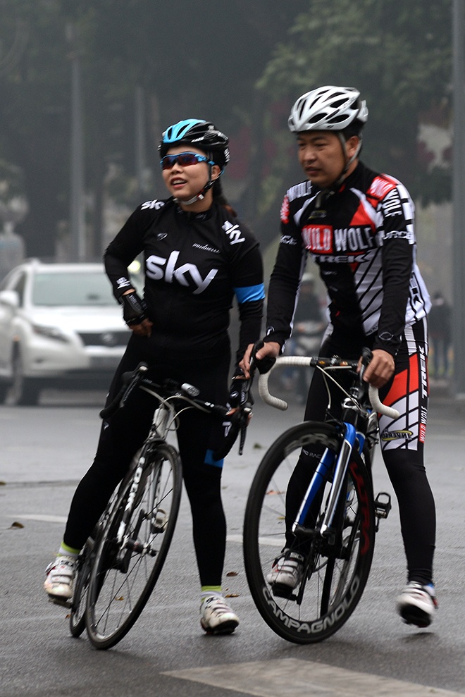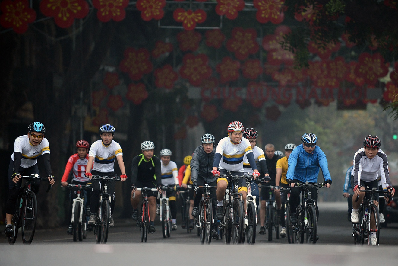 | Mờ sáng 1 Tết, từng tốp xe đạp bắt đầu xuất hiện trên khắp các tuyến phố của Hà Nội. |