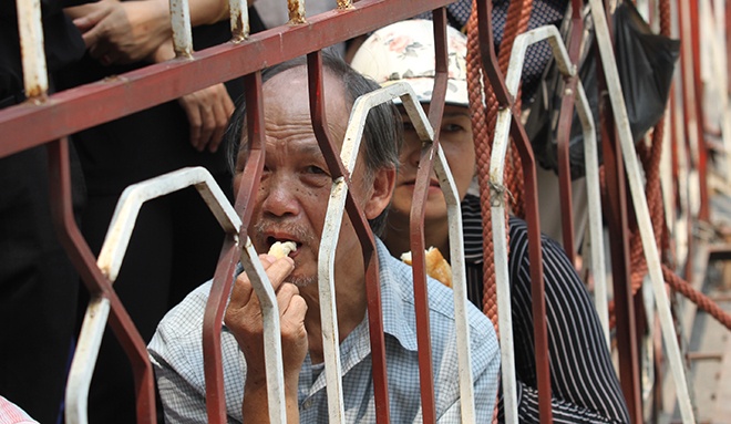 Tranh thủ ăn bánh mỳ trong lúc xếp hàng chờ viếng.