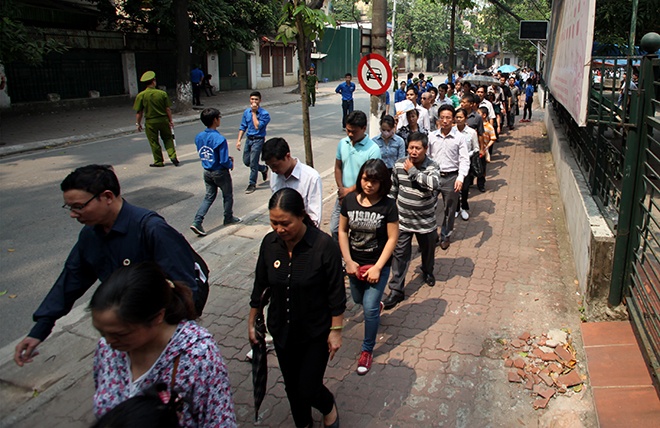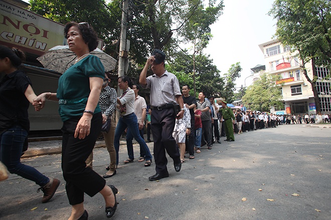 Dù giữa trưa, trời nắng nhưng người dân vẫn xếp hàng ngay ngắn chỉnh tề để đợi lượt vào viếng.
