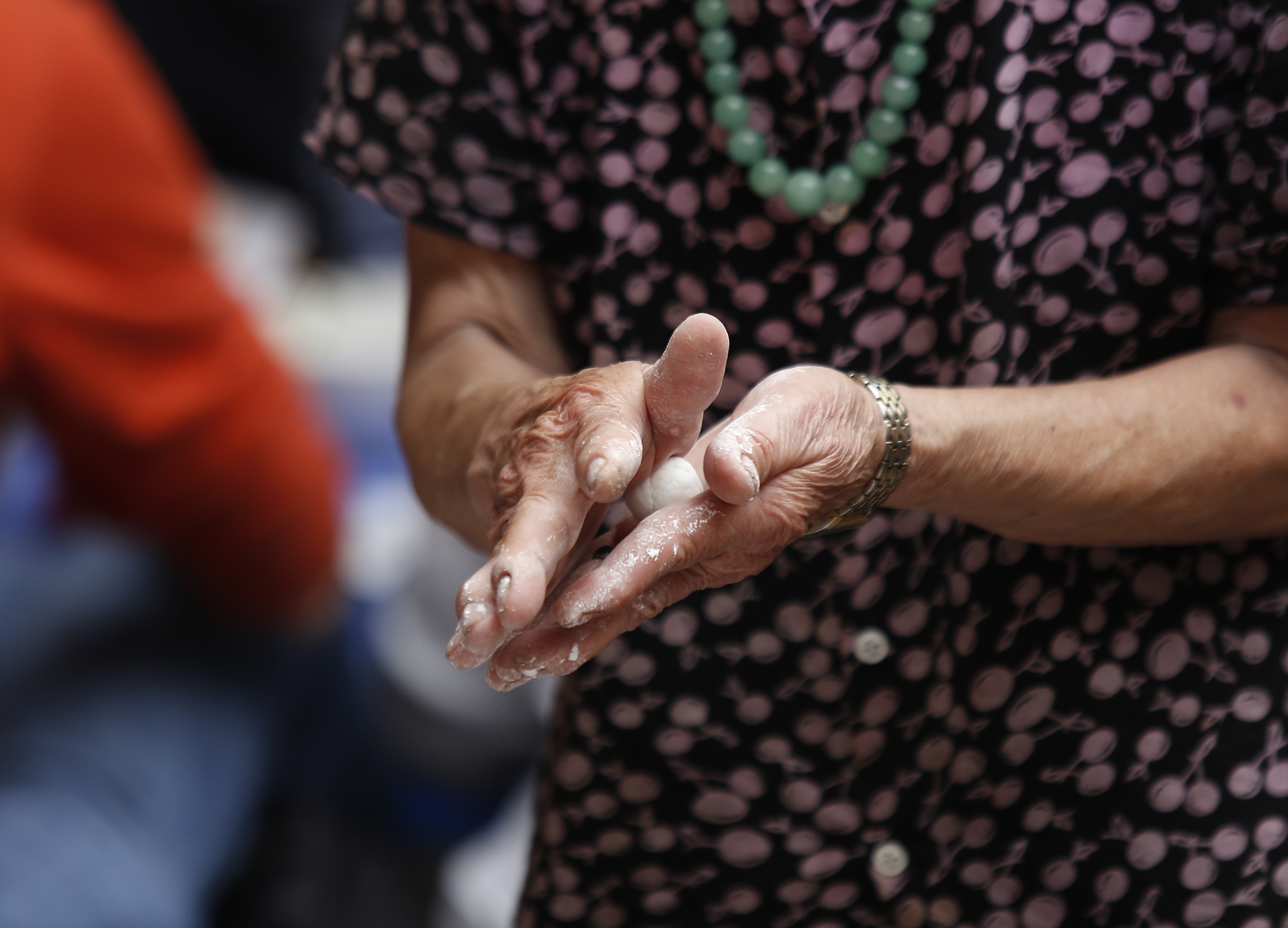 Bánh trôi được túm gọn lại bọc đường trước khi vo tròn rồi thả vào nồi.