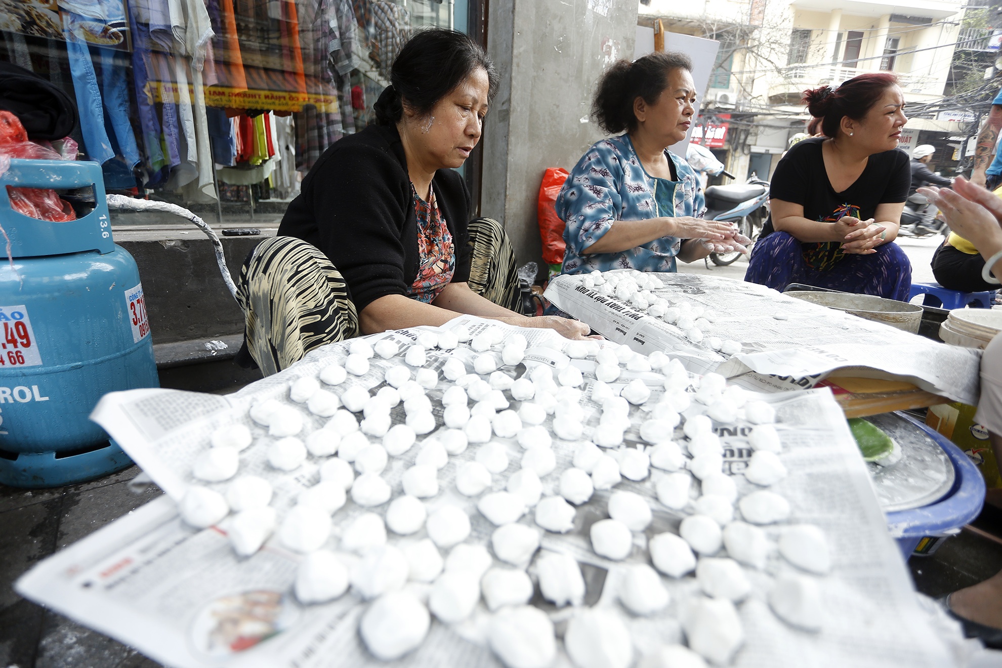 Còn trên phố Hàng Điếu, những quán bán loại bánh này cũng mọc lên. Cô Thảo (bên trái) cho biết, ngày thường nhà cũng bán bánh trôi, bánh chay, riêng ngày Tết Hàn thực sản xuất nhiều hơn để phục vụ người dân.